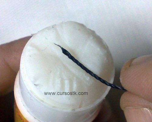 - Se achar necessário, passe as pontas dos fios na cola de bastão, para evitar que desfiem, e facilite a passagem do mesmo pelo buraco da conta.